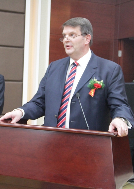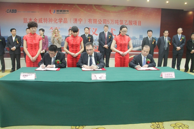 李合军在致词中讲到,金威煤电公司依托自身资源优势和现有氯乙酸生产装置,与世界知名的化工企业德国凯本公司合作,组建凯本金威特种化学品(济宁)有限公司,不仅实现了优势资源与先进技术和资本的有效对接融合,而且为金威煤电加快推进精细化工产业发展,实现产业升级搭建了技术平台,迈出了走向国际市场,参与国际合作的第一步,是企业发展的重大突破。