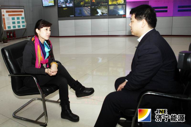 图为副总工程师王利在阳城煤矿调度指挥中心接受济宁电视台主持人安舒现场采访