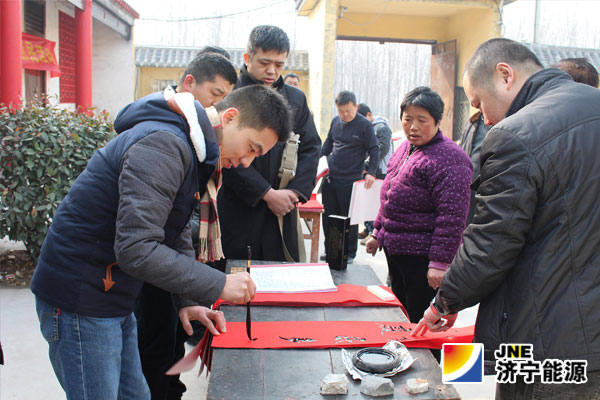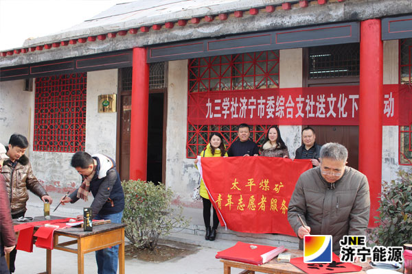 2月14日,太平煤矿团委组织矿青年志愿者联合九三学社济宁市委综合支社、济宁市政协书画联谊会、邹鲁画院的书法家们一起来到邹城市太平镇秦河村为村民义务写春联,送出新春的祝福。